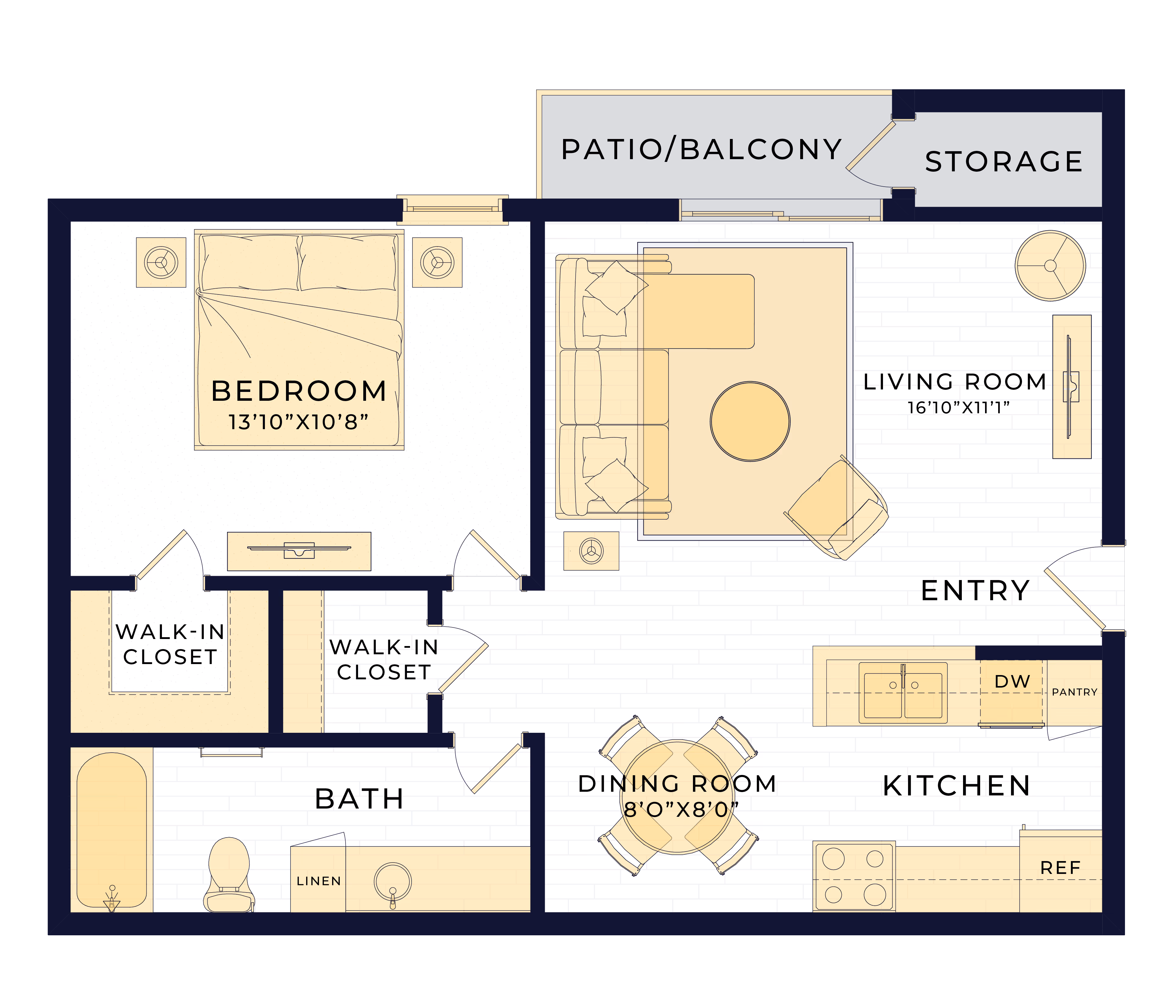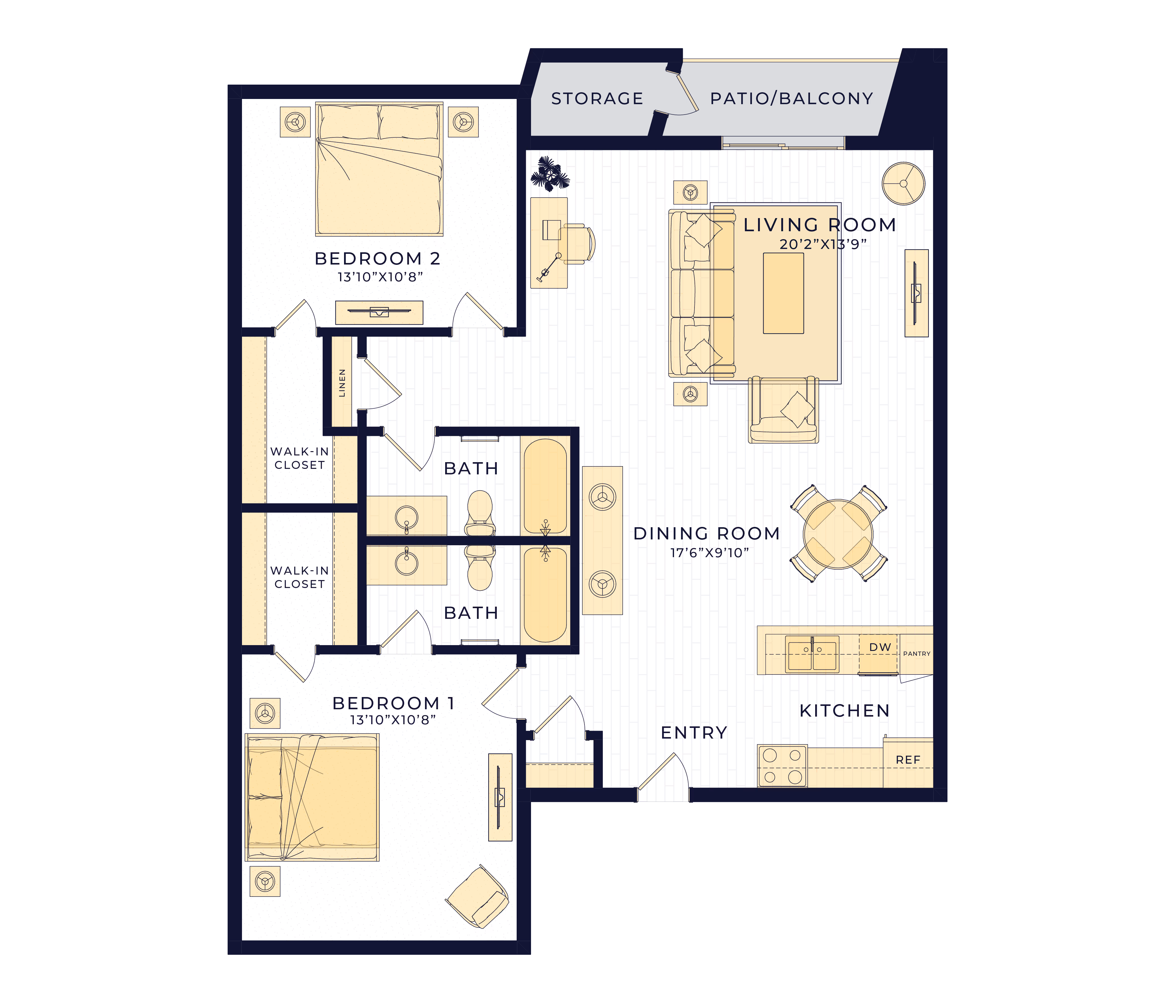 We offer one- and two-bedroom units, each designed to meet different lifestyle needs. Our two-bedroom apartments feature generous space, complete with walk-in closets in both bedrooms and two full bathrooms.